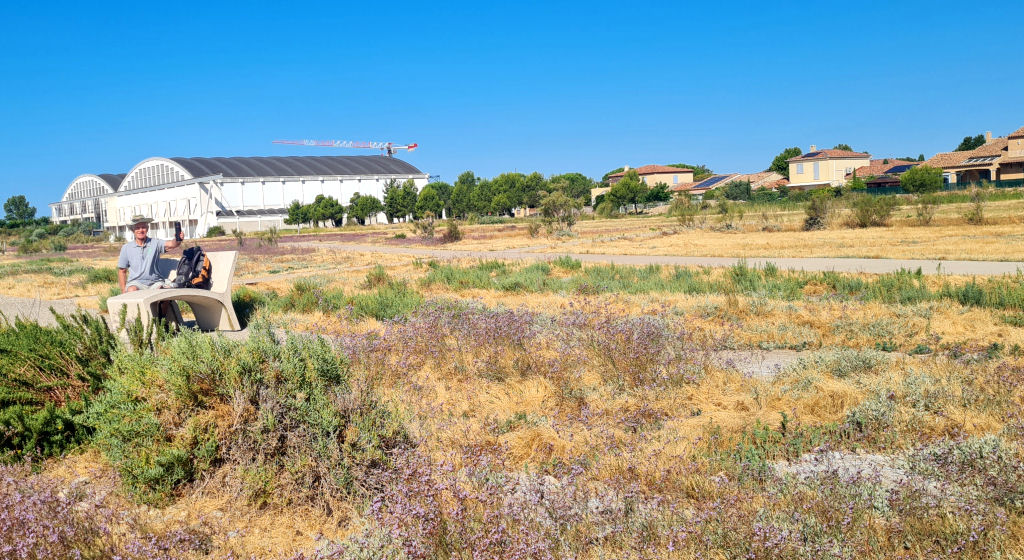 un champs de saladelle, un banc, un café !