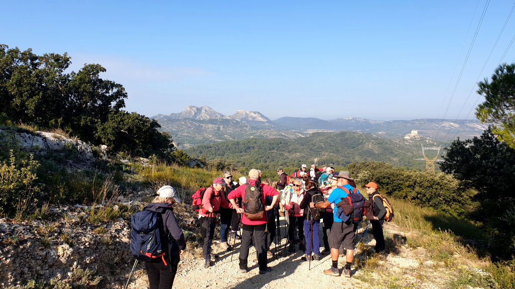 On est dans les Alpilles. Vue sur leur sommet avec les Opies qui culminent à 496 mètres; A droite l'ancien castrum de Roquemartine